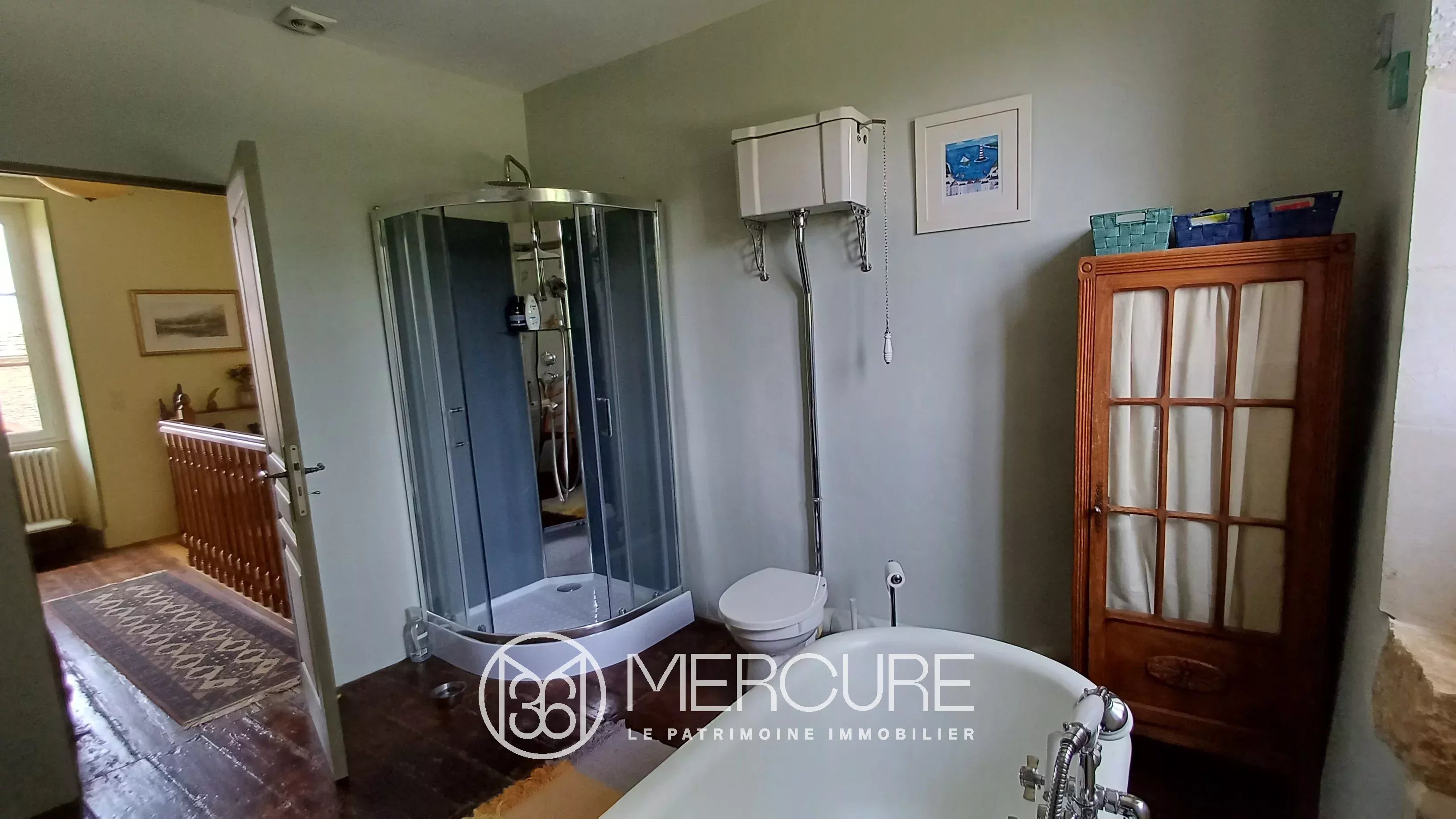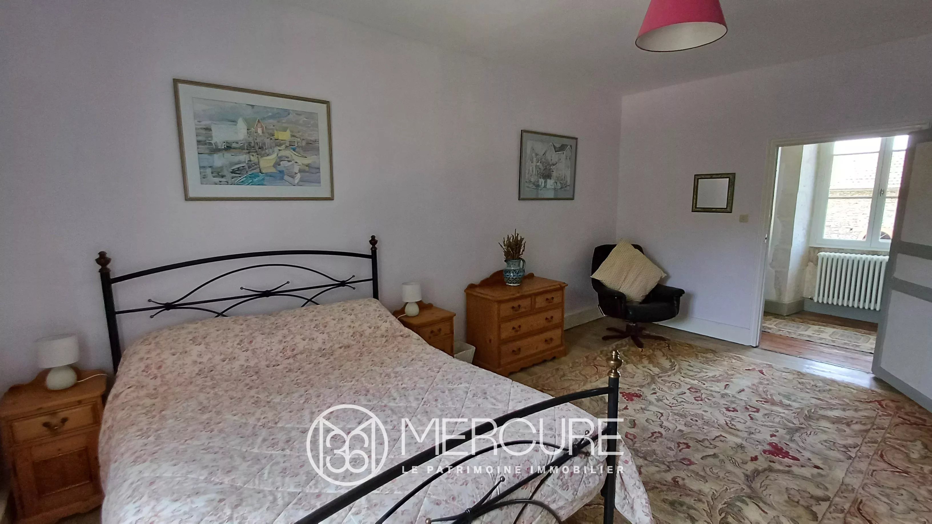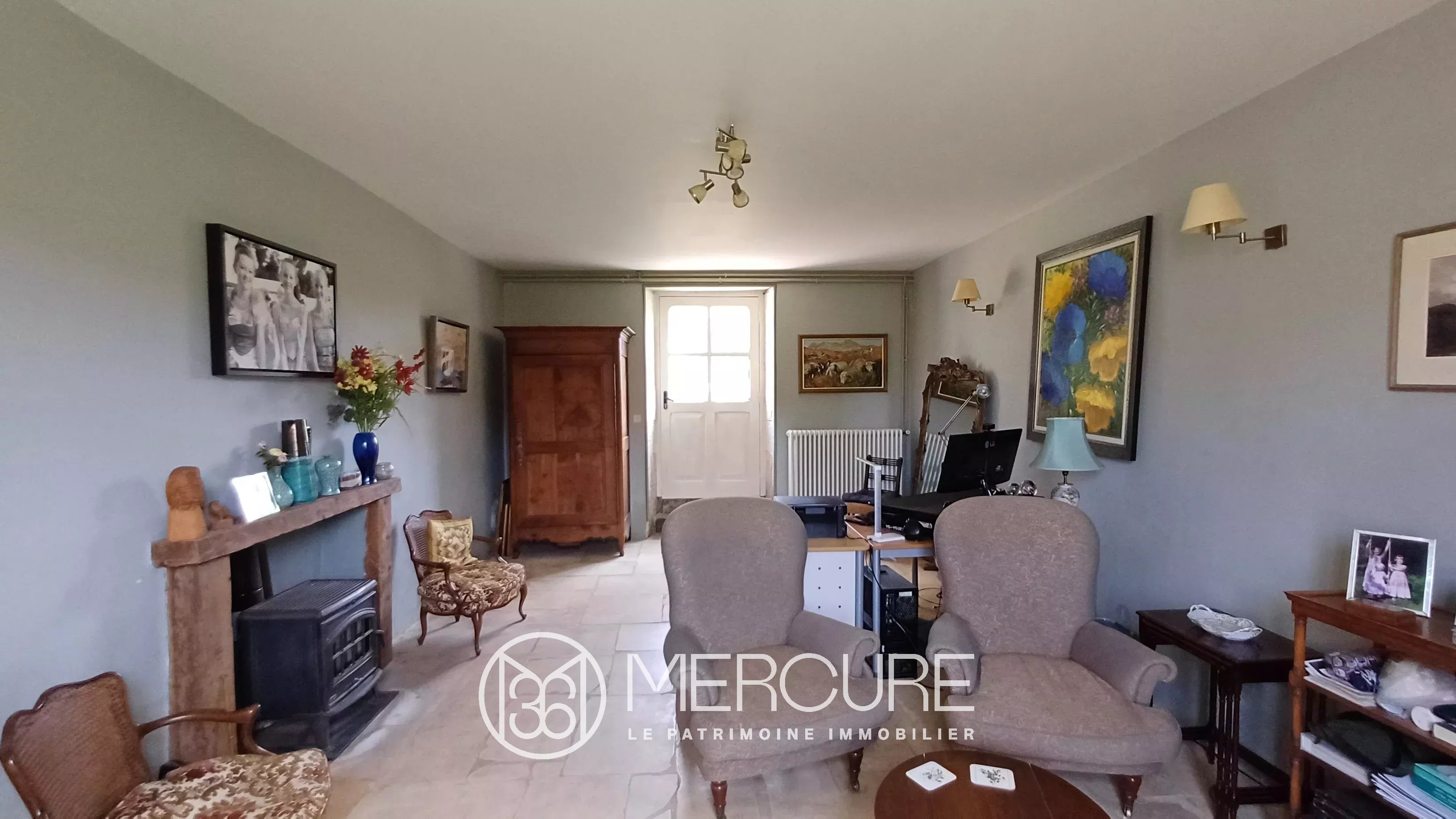 The dwelling is heated by a heat pump, complemented by wood-burning stoves in the main rooms on the first floor. Double-glazed wooden joinery blends harmoniously with the façade. Sanitation is provided by a septic tank.