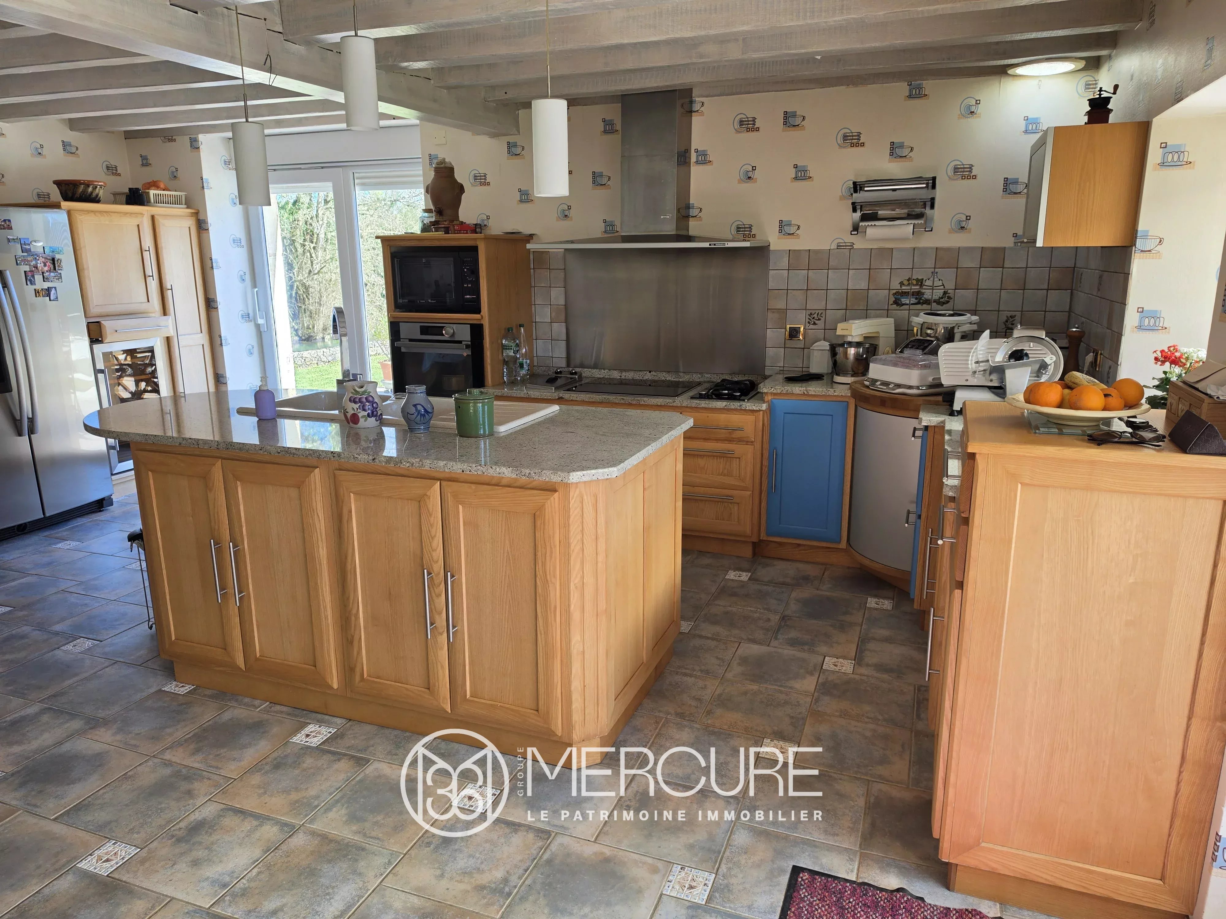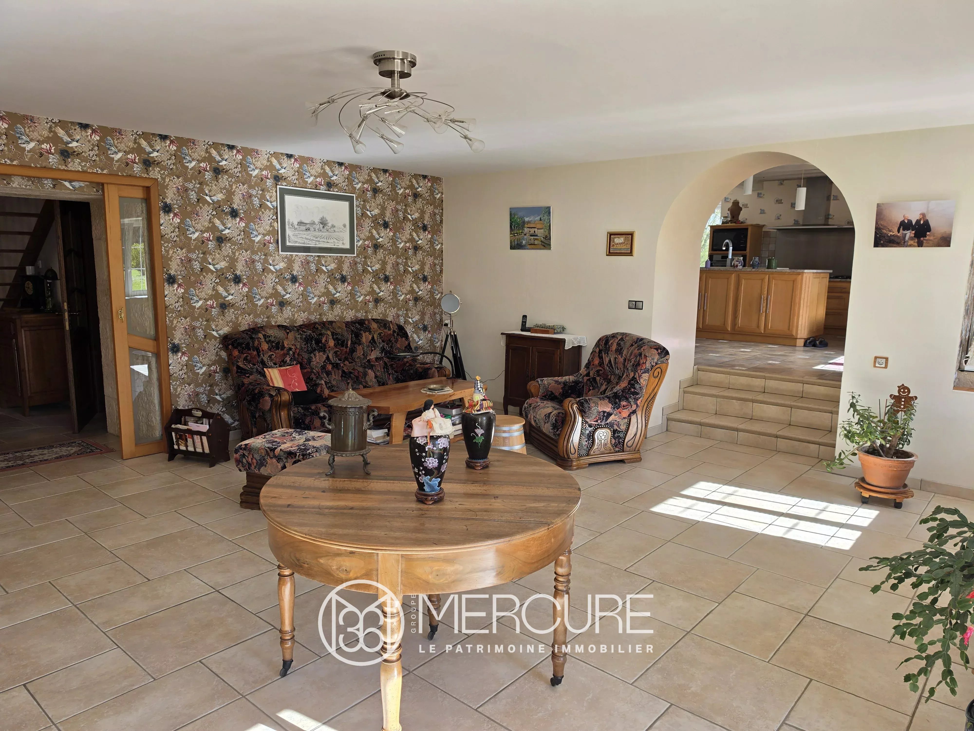 L’organisation intérieure du moulin est particulièrement harmonieuse. Au rez-de-chaussée, un vaste hall d’entrée de 24 m² offre une vue directe sur la roue du moulin en activité. Il dessert un salon de 37 m² doté d’une cheminée, une salle à manger de 24 m² ainsi qu’une cuisine entièrement équipée avec coin repas de 30 m². Une salle d’eau de 6,2 m² complète ce niveau.
