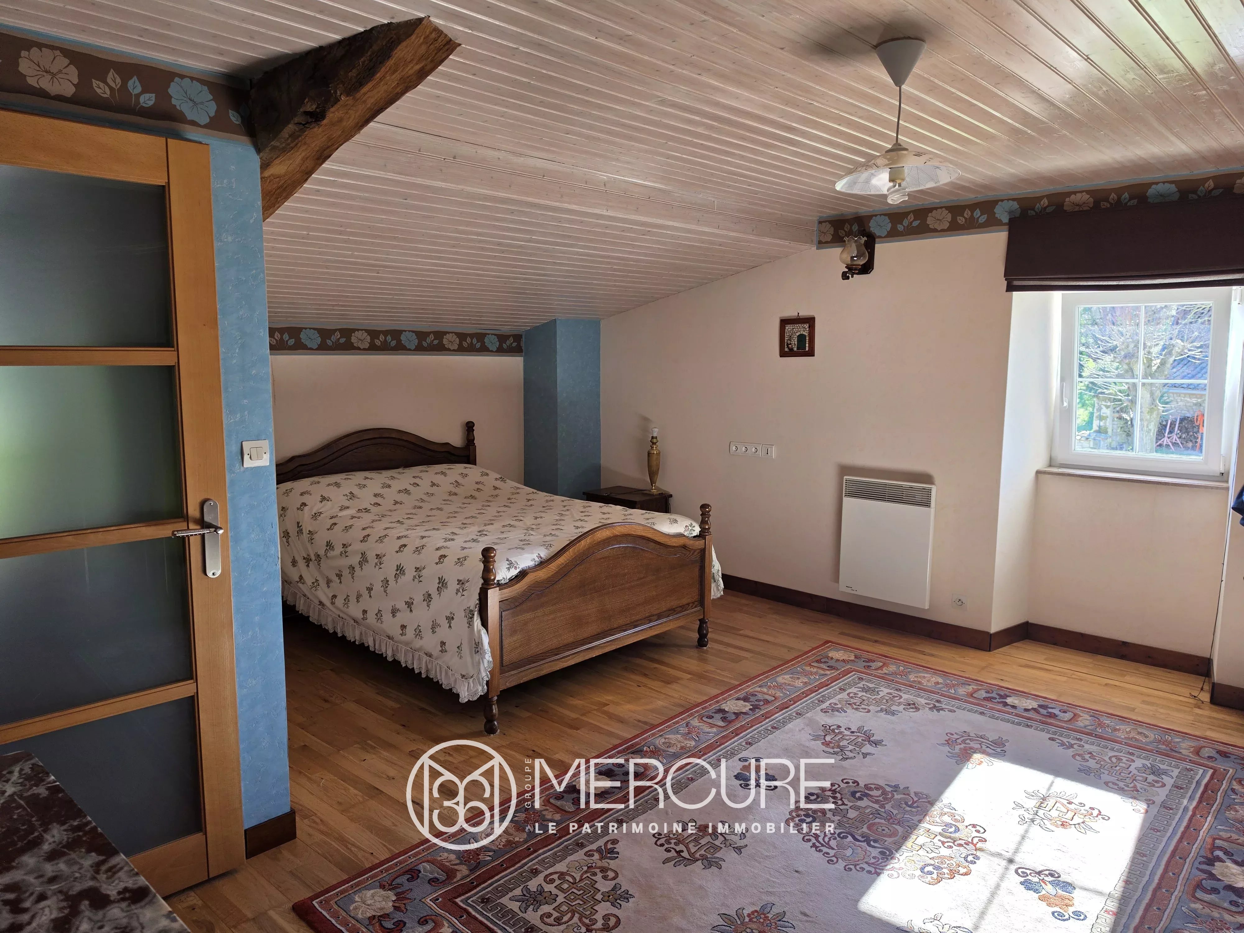 À l’étage, une mezzanine de 24 m² surplombe la roue du moulin. Une suite parentale de 20 m² avec salle d’eau privative s’ajoute à trois autres chambres de 12 m², 15,5 m² et 24 m². Une salle de bains de 9 m² et un WC indépendant complètent cet étage. Les combles offrent un grenier aménagé d’une superficie de 35 m² au sol, idéal pour un espace supplémentaire polyvalent.